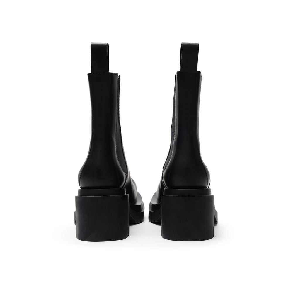 Bottega Veneta Black Leather Lug Ankle Boots. Maxi black lug sole with heel, round toe, brushed leather, elastic side bands, and a pull-tab at the back for easy on and off.