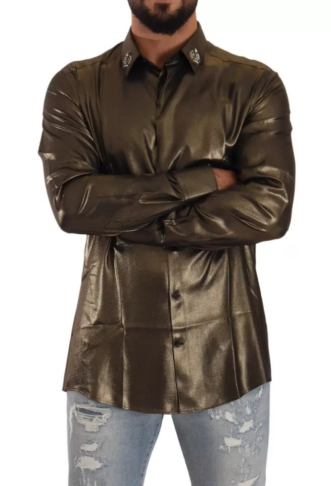 Dolce & Gabbana Metallic Gold DG Embroidered Crown Silk Top Shirt